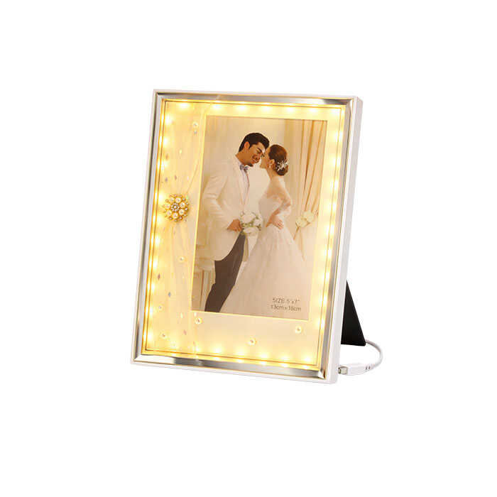 13x18 cm fotoğraf alanına sahip, aynalı iç tasarımlı ve inci-broş detaylı 3 ışıklı LED düğün fotoğraf çerçevesi. USB ile çalışır, beyaz, sarı ve sarı-beyaz olmak üzere 3 farklı ışık seçeneği sunar. Yeni evliler için şık ve modern bir hediyelik üründür.