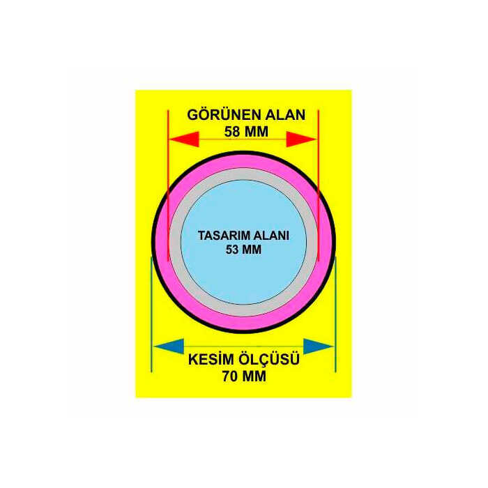 TASARIM; Bir rozetin tam alanı 58mm dir. Ancak grafik çalışmanızı 70mm alan içinde, merkezde 53mm çapında hazırlar iseniz 58mm rozet üzerinde görünen tasarım alanı üzerinde tasarım kaybı yaşamadan baskı yapabilirsiniz,