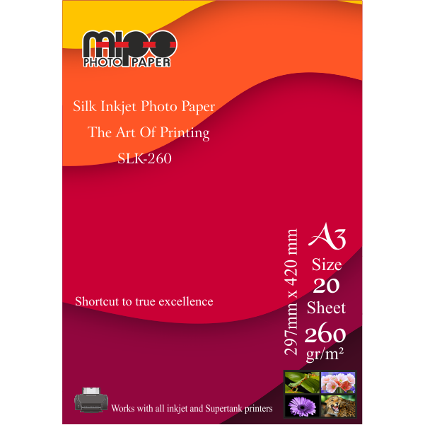 Mipo 260SLK ipek mat, klasik bir inkjet fotoğraf kağıdıdır. İnkjet yazıcılarda mürekkep püskürtme yolu ile fotoğraf baskısı için geliştirilmiş bu kağıdın özel yüzeyinde özellikle fotoğraf uygulamaları için tasarlanmış, mikro gözenekli özel bir kaplama mevcuttur. Mikro gözenekli bu katman inkjet fotoğraf kağıdı için kullanılan en üstün kaplamadır. Kaplama, silika veya alümina bazlı mikro gözeneklere sahiptir. Bu kaplamanın, gözeneklerinden dolayı her türlü mürekkep, boya ve pigment kağıt yüzeyinde mükemmel bir şekilde tutunur. İşte bu özel kaplama ve kaliteli taban kağıdı sayesinde fotoğraflarınızı mükemmel bir şekilde basabilirsiniz.