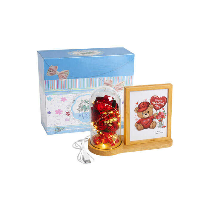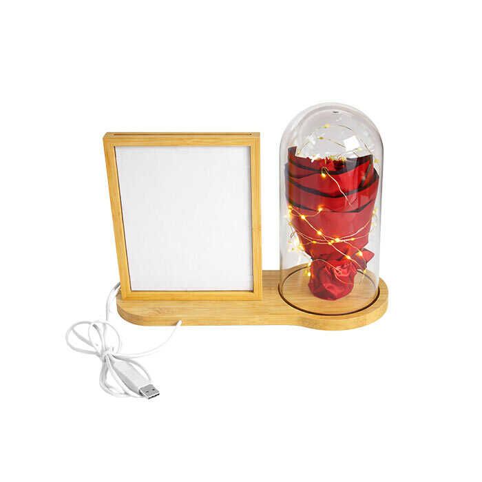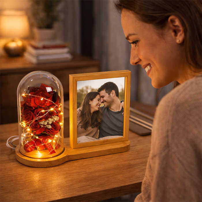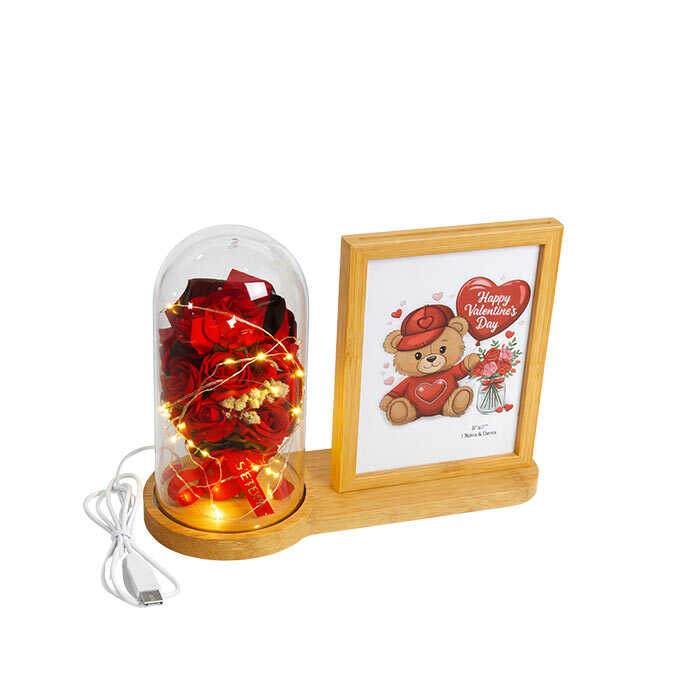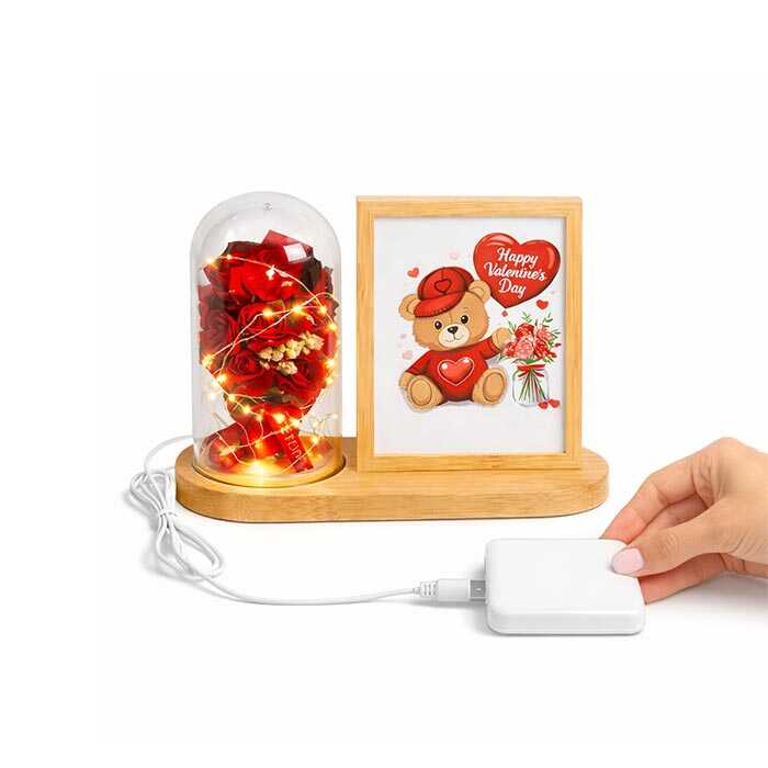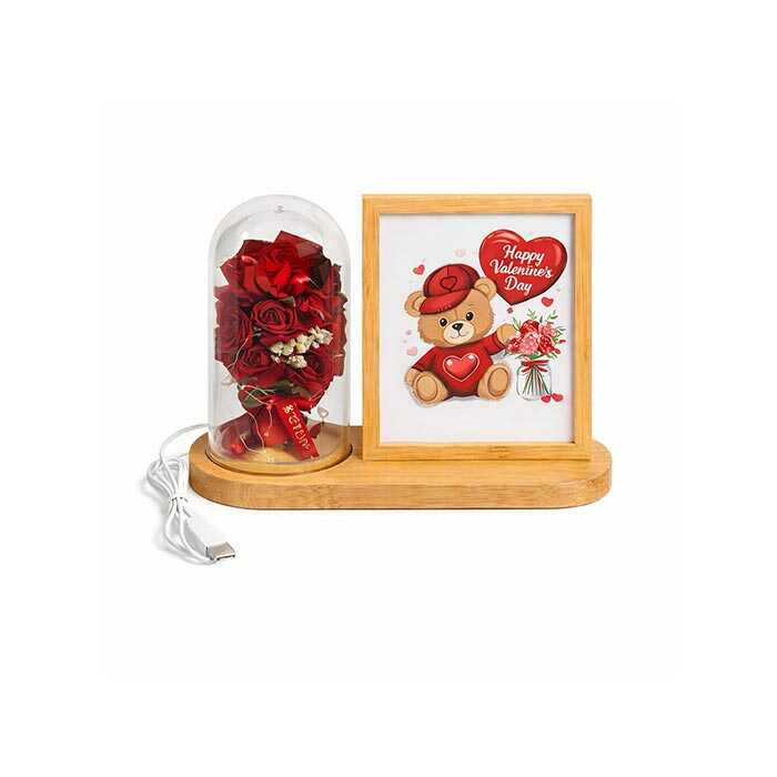 Doğal ahşap gövdeli, fanus içinde LED ışıklı kırmızı gül buketi ve 13x18 cm çift taraflı fotoğraf alanı bulunan şık masaüstü fotoğraf çerçevesi. USB ile çalışır, romantik ve hediyelik tasarımıyla sevgililer günü, doğum günü ve yıl dönümü için ideal bir üründür.