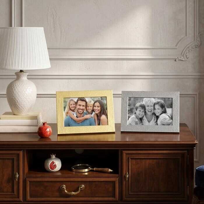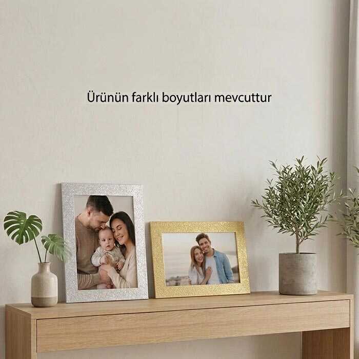 Ürün; 10×15 cm ve 15×20 cm fotoğraf ebatlarıyla üretilmekte olup, dikey ve yatay kullanım seçeneği sunar. 15x20 cm resim çerçevemiz duvara asmaya uygun olduğundan duvar dekorasyonunuzda da kullanabilirsiniz. Aynı ürün ailesi altında iki farklı ebat ve iki farklı renk (metalik altın – metalik gümüş) bulunması çerçevelerinizle farklı kombinasyonlar üretebilmenize yardımcı olur.