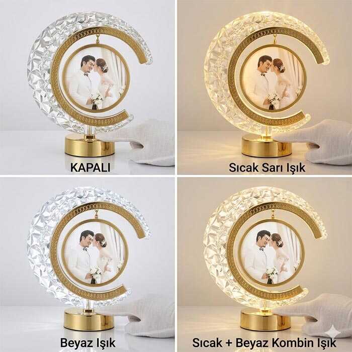 Hilal formunda tasarlanmış, 10x10 cm yuvarlak fotoğraf alanına sahip dokunmatik LED ışıklı dekoratif gece lambası. 3 renk modlu (sarı, beyaz, sarı-beyaz) aydınlatma özelliği, kristal görünümlü dış tasarımı ve altın detaylı kaidesi ile hem romantik hem şık bir hediyelik üründür. Hediyelik gül baskılı özel kutusunda gönderilir.