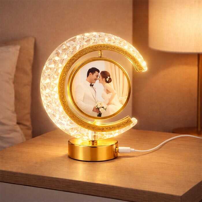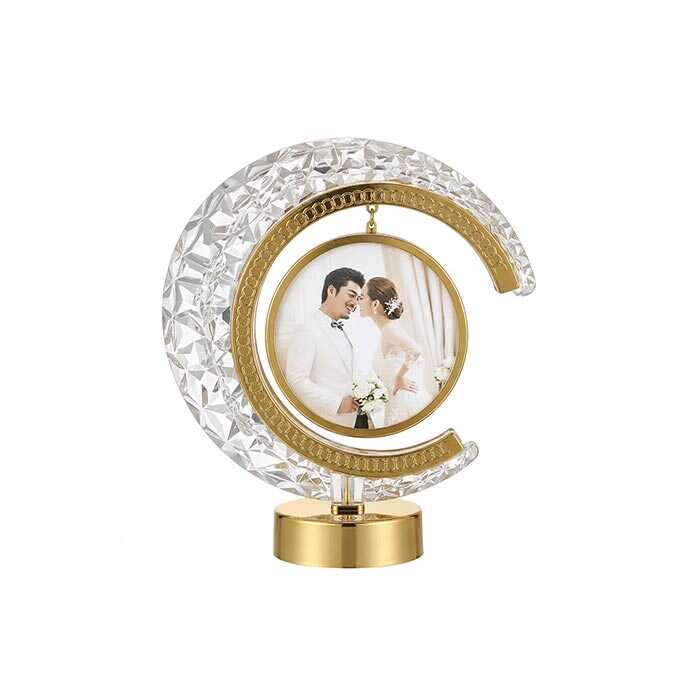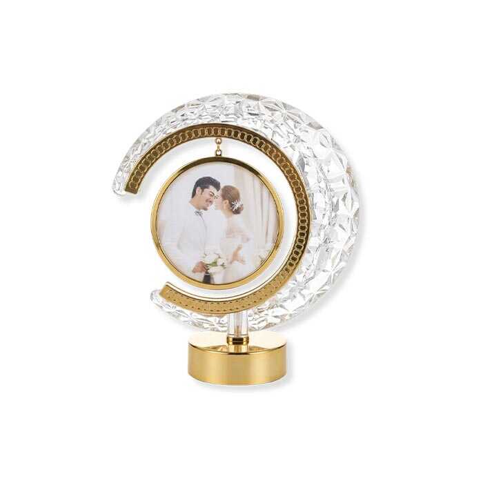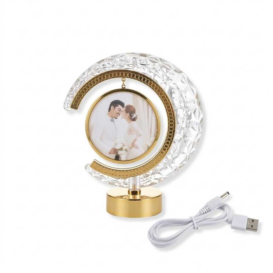Dokunmatik Hilal LED Işıklı Yuvarlak Fotoğraf Çerçevesi 10x10 – 3 Renkli yanan Gece Lambası, Kristal & Altın Dekor