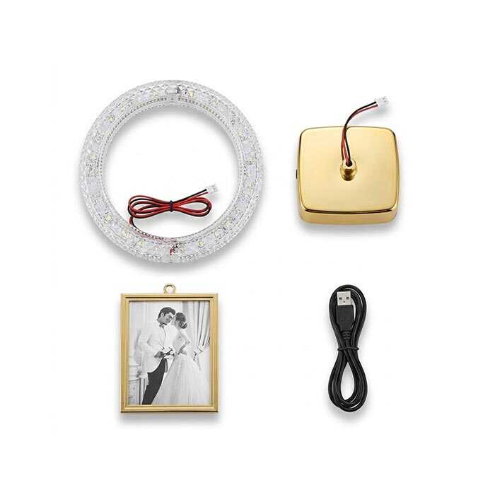 LED’li Kristal Halka Fotoğraf Çerçevesi – Çift Taraflı Askılı Dörtgen İç Çerçeveli Altın Dekoratif Masaüstü (USB & Pilli)