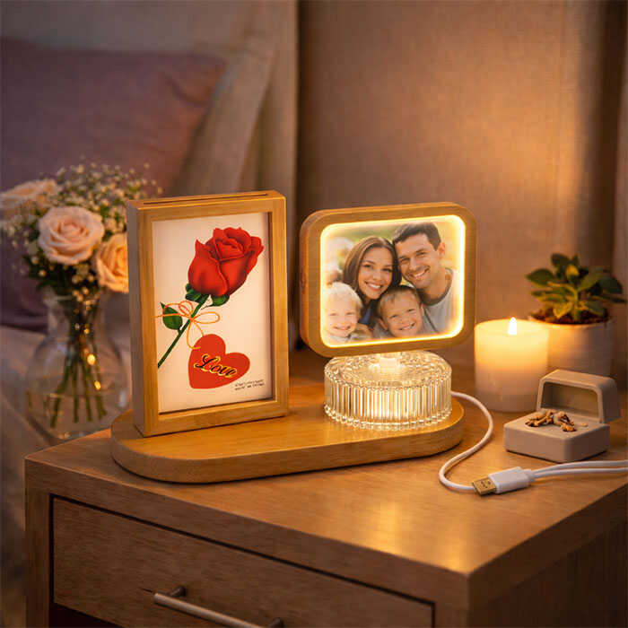 Doğal ahşaptan üretilmiş, dönen mekanizmalı ve LED gece lambası özellikli masaüstü fotoğraf çerçevesi; 4 adet fotoğraf kapasitesi ile yıl dönümü hediyesi, sevgiliye hediye, doğum günü hediyesi ve özel gün hediyesi olarak yüksek talep gören dekoratif bir üründür. USB kablo ile çalışır, hediyelik kutusunda gönderilir ve toptan satışa uygundur.
