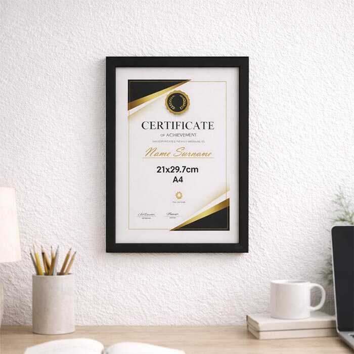 A4 Siyah MDF Sertifika & Diploma Çerçevesi; kurumsal alanlar, ofisler, eğitim kurumları ve profesyonel mekânlar için özel olarak tasarlanmış, şık ve sağlam bir çerçeve çözümüdür.
