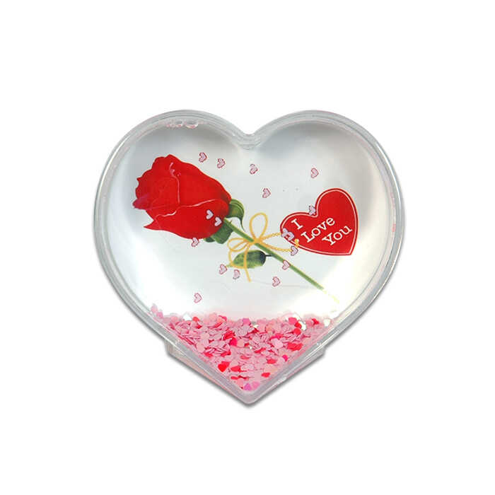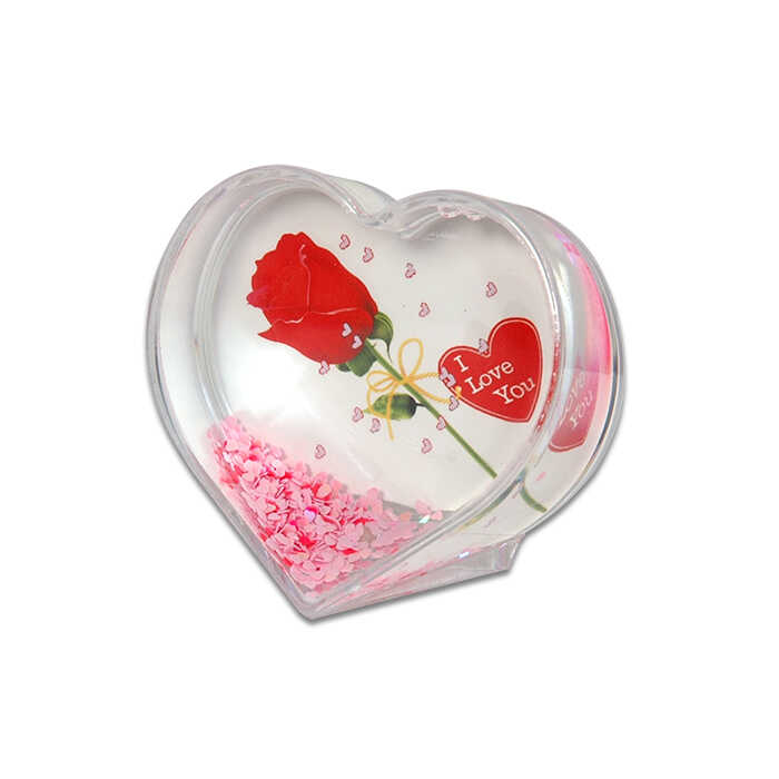 İçerisindeki şeffaf sıvı ve kalp şeklindeki pullar ile kar efekti oluşturmaktadır.