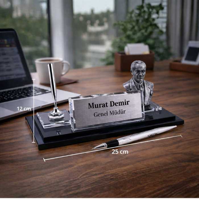 Gösterişli ofislerin ayrıcalıklı ve vazgeçilmez parçalarından biri de kristal masa isimlikleridir. Tamamı el işçiliği ile yerli olarak ürettiğimiz 70 adetten fazla kristal masa isimlik modeli arasında yer alan bu özel modelimiz ile kendi ofisinize şık bir dokunuş yapın veya yeni işe başlayan, terfi alan dostlarınıza gururla sergileyecekleri bir ofis hediyesi olarak verin. Koleksiyonumuzun bu özel parçasında sizlere kusursuz bir el işçiliği ve 1.sınıf kristal malzeme kalitesi sunmaktayız.