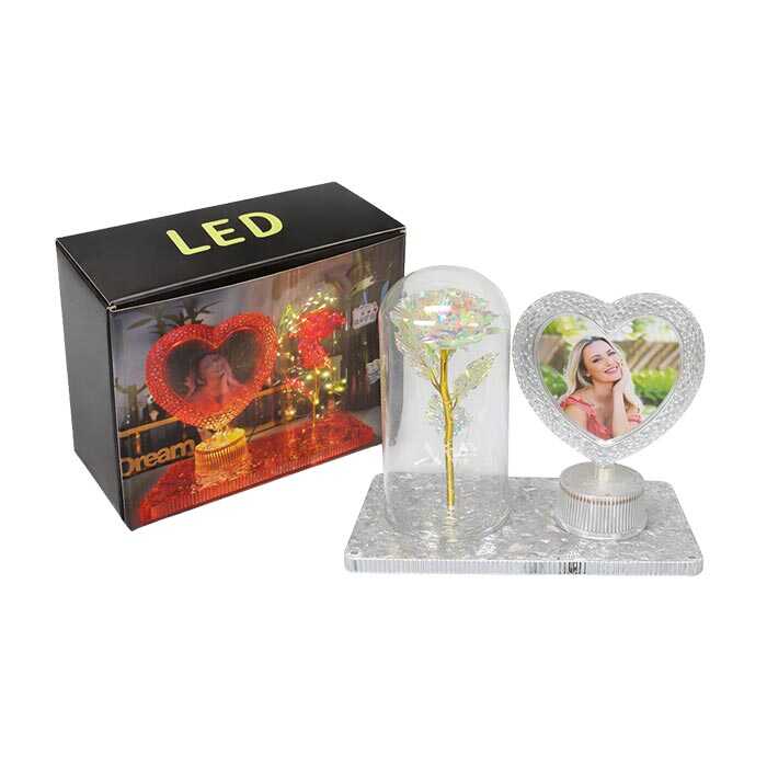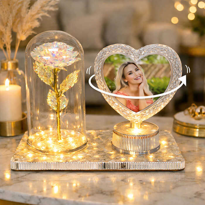 Fanus içinde LED aydınlatmalı holografik gül ve kendi etrafında dönen çift taraflı kalp fotoğraf çerçevesi ile tasarlanan bu romantik masaüstü dekor ürünü, Sevgililer Günü, yıl dönümü ve özel günler için etkileyici bir aşk hediyesidir.