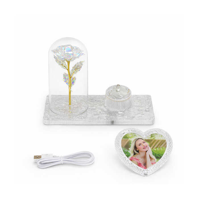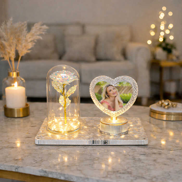 Işıklı Fanus Gül & Dönen Kalp Fotoğraf Çerçevesi, romantik dekor kategorisinde premium segmentte yer alan özel bir masaüstü üründür. Sol bölümde şeffaf fanus içinde yer alan LED aydınlatmalı, holografik yansımalı gül; sağ bölümde ise kendi ekseni etrafında dönen kristal kalp fotoğraf çerçevesi bulunur.