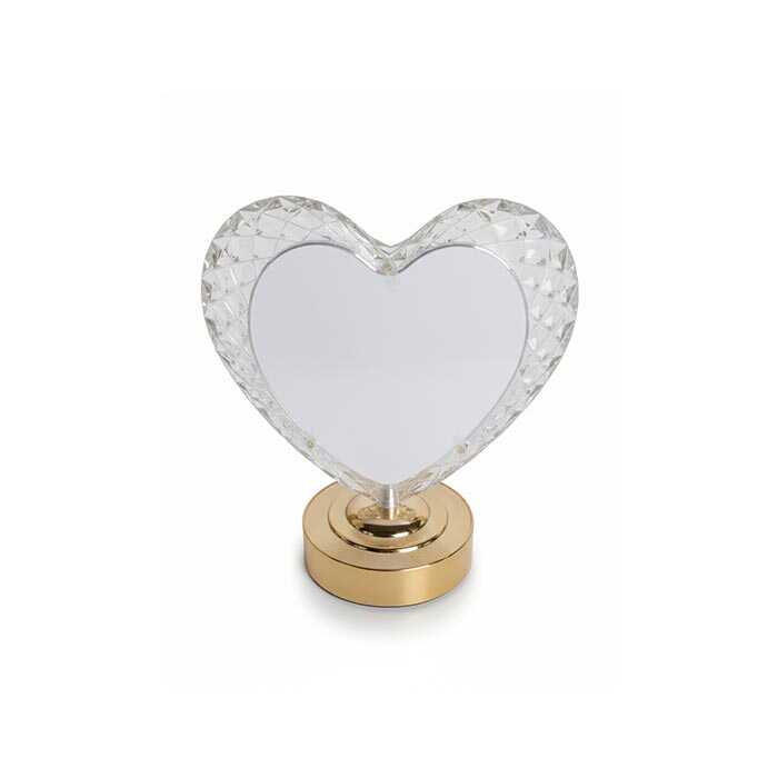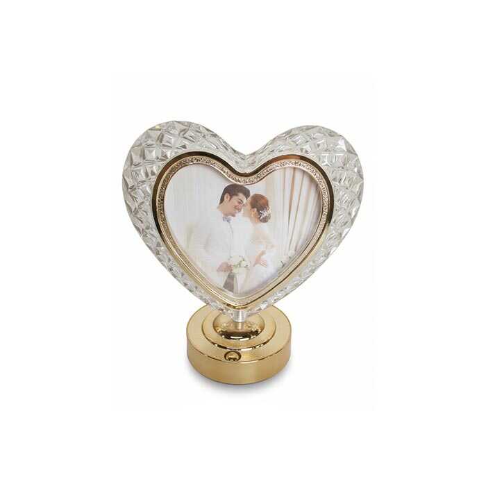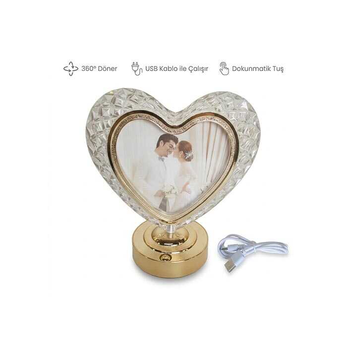14x14 cm fotoğraf alanına sahip, kristal görünümlü kalp tasarımlı LED ışıklı fotoğraf çerçevesi. USB ve 3xAA pil ile çalışabilen, dokunmatik 3 renk modlu (sarı, beyaz, sarı-beyaz) gece lambası ve abajur özelliğine sahiptir. Sevgiliye, eşe, nişanlıya ve özel günlerde hediye edilebilecek şık bir hediyelik üründür. Gül baskılı özel kutusunda gönderilir.