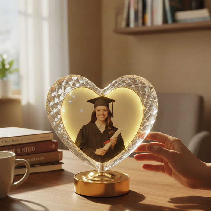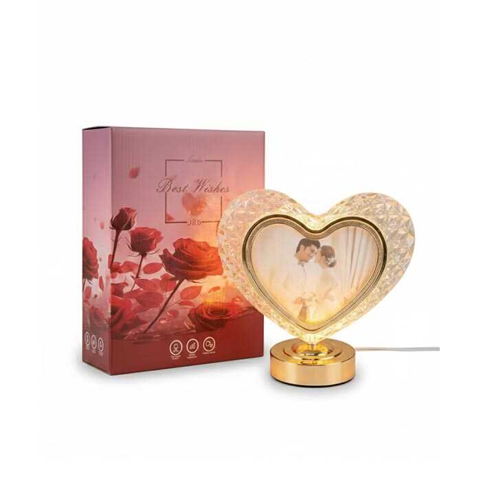 Işıklı Kristal Kalp Fotoğraf Çerçevesi, hem romantik bir hediyelik eşya hem de dekoratif bir gece lambası (abajur) olarak tasarlanmış özel bir üründür.