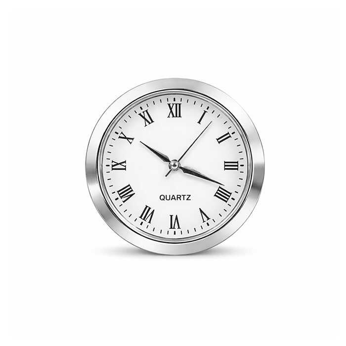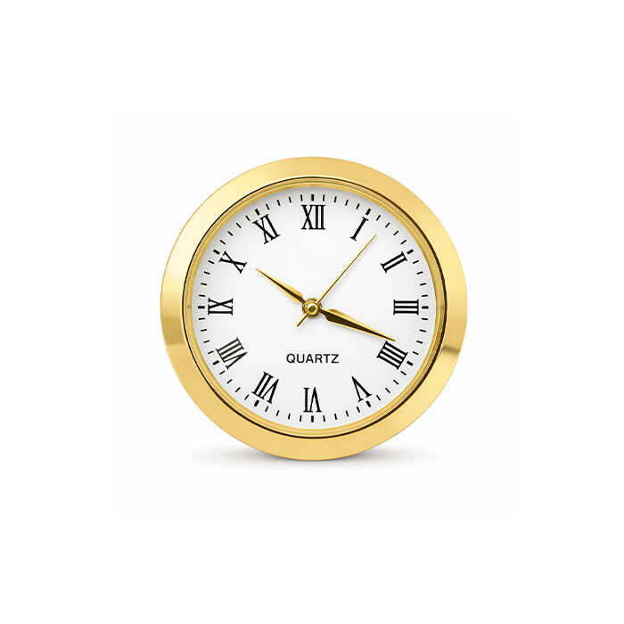 36 mm çapında geçmeli masa isimliği saati, masaüstü isimlikler ve dekoratif masa aksesuarları için tasarlanmış quartz mekanizmalı mini saat modelidir. Altın renkli metal kasası ve Roma rakamlı kadranı ile klasik bir görünüm sunar.