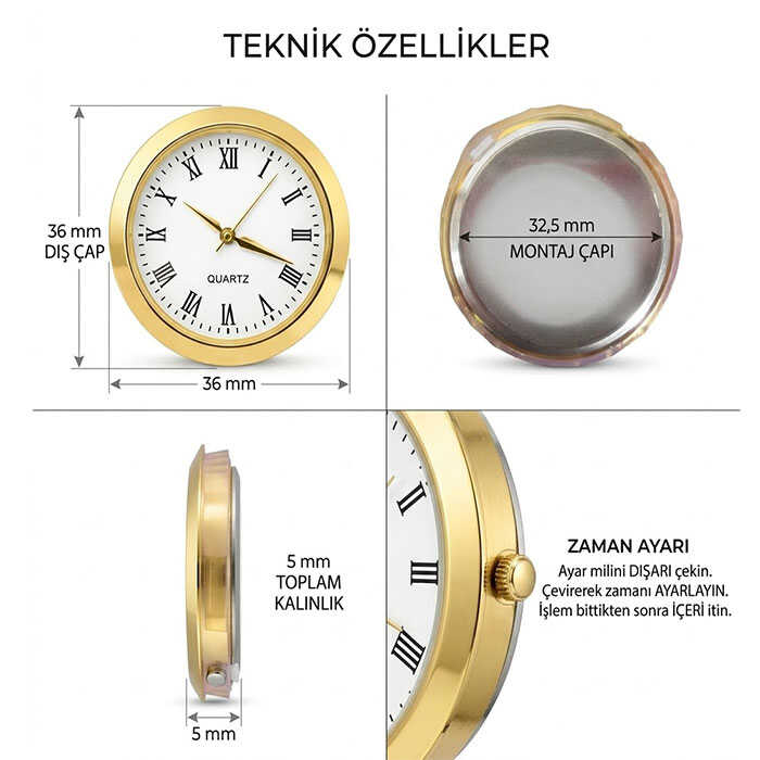 Altın renkli metal kasaya sahip olan bu model, Roma rakamlı klasik kadranı sayesinde dekoratif ürünlerde şık ve klasik bir görünüm sağlar. Küçük boyutlu yapısı sayesinde özellikle: