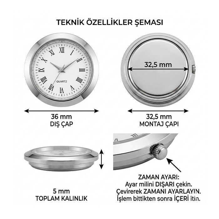 36 mm geçmeli masa isimliği saati, masaüstü isimlikler, masa dekorasyon ürünleri ve çeşitli masaüstü aksesuarlarında kullanılmak üzere tasarlanmış kompakt bir saat mekanizmasıdır.