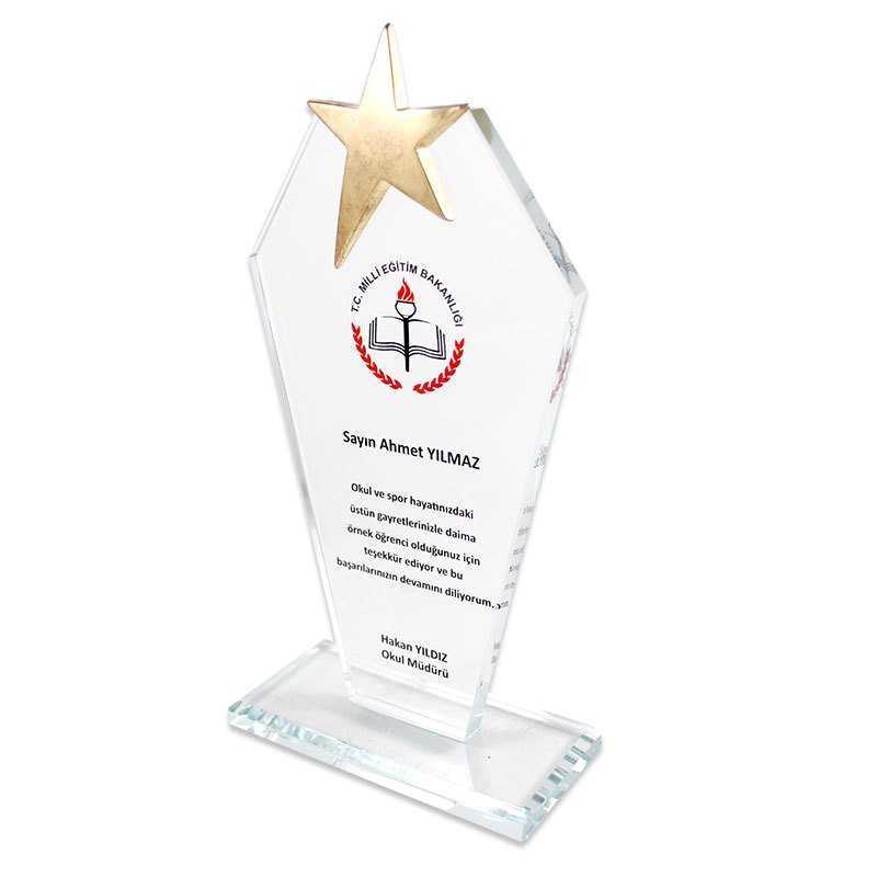 1018 Kristal plaket temelde şeffaf kristal alt kaide, kristal baskı alanı ve altın sarı metal yıldızdan oluşur. Alt taban kısmında kristalden 5,5x12 cm ebatında 10mm kalınlığında kristal bir kaidesi bulunur. Kaide üzerinde 5x11x20 cm ebatında yine kristalden üretilmiş baskı alanı vardır. Baskı alanının üst kısmında 6x8 cm lik altın sarı metal yıldız bulunur. Toplam net ağırlığı 600 gramdır. Yüksekliği 23,5 cm dir.