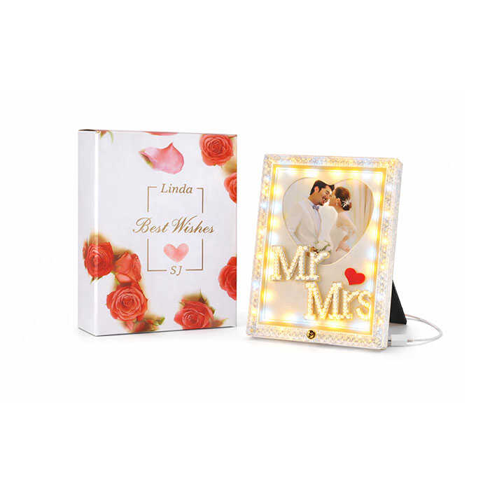 Düğün ve evlilik temalı, kalp biçimli fotoğraf alanına sahip, 3 renk (beyaz, sarı ve beyaz+sarı birlikte) LED aydınlatmalı sihirli ayna fotoğraf çerçevesi. USB ile çalışır. İnci detaylı “Mr & Mrs” yazısı ve kırmızı kalp aksesuarı ile özel günler için şık bir hediyedir.