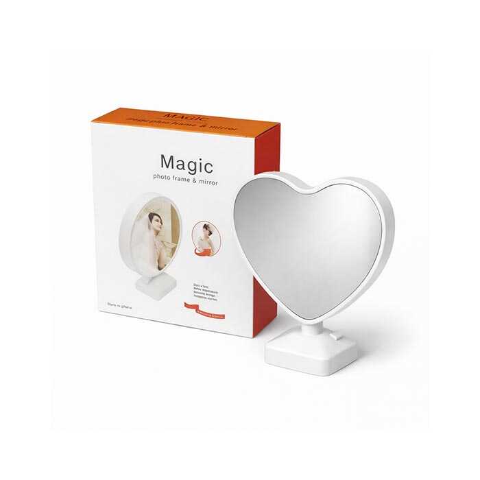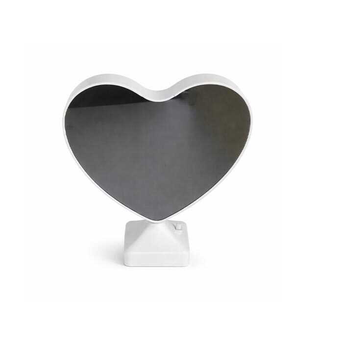 Sihirli Ayna Kalp Fotoğraf Çerçevesi, ışık kapalıyken aynalı yüzey olarak kullanılabilir. LED aydınlatma açıldığında ise iç kısmındaki fotoğraf görünür hale gelir ve ürün şık bir gece lambasına dönüşür.