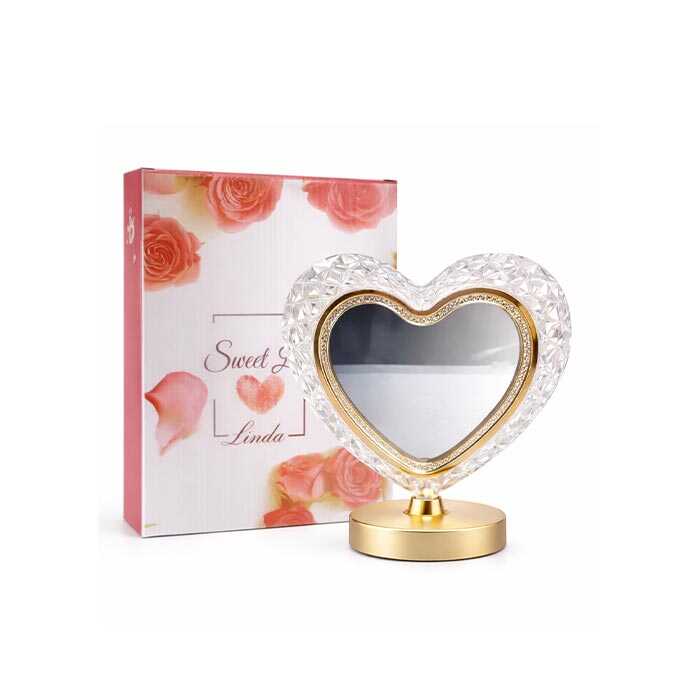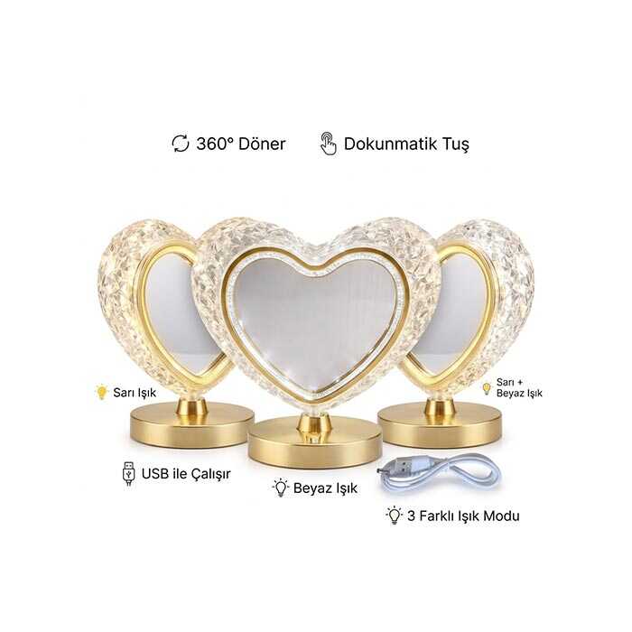 Sihirli ayna (magic mirror) özelliğine sahip, 14x14 cm fotoğraf alanlı kristal kalp tasarımlı LED ışıklı gece lambası. Işıklar kapalıyken ayna görünümü sunar, ışıklar açıldığında fotoğraf ortaya çıkar. USB ve 3xAA pil ile çalışır. Sevgiliye, eşe ve özel günlerde hediye edilebilecek romantik bir dekoratif üründür.