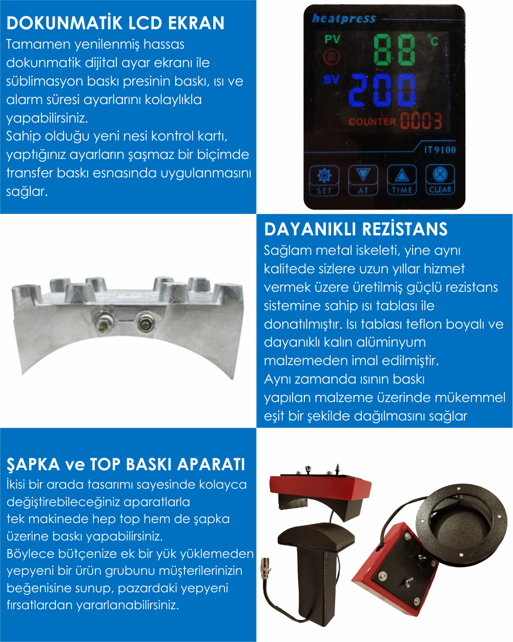 Top haricinde yine spor kulüpleri, şirketler, siyasi partiler ve okullar tarafından adetli olarak tüketilen şapka baskı işinizi de yine bu harika preste yapabilirsiniz. Kolayca sökülüp takılabilen aparatları ile bir dakikadan kısa sürede top baskısından şapka baskısına geçebilirsiniz. Digitronix BHP01dijital şapka ve top presi birçok farklı ebatta şapkaya baskı yapabilmenizi sağlar. Bu özel şapka ve top presi aslında sadece şapka ve toplara baskı yapmak için değil, büyük presler altında zarar görmesi muhtemel hazır dikilmiş yada dikim aşamasındaki kumaşların bir bölümüne logo baskısı gibi ufak baskı uygulamalarında da en yakın yardımcınız olacaktır.